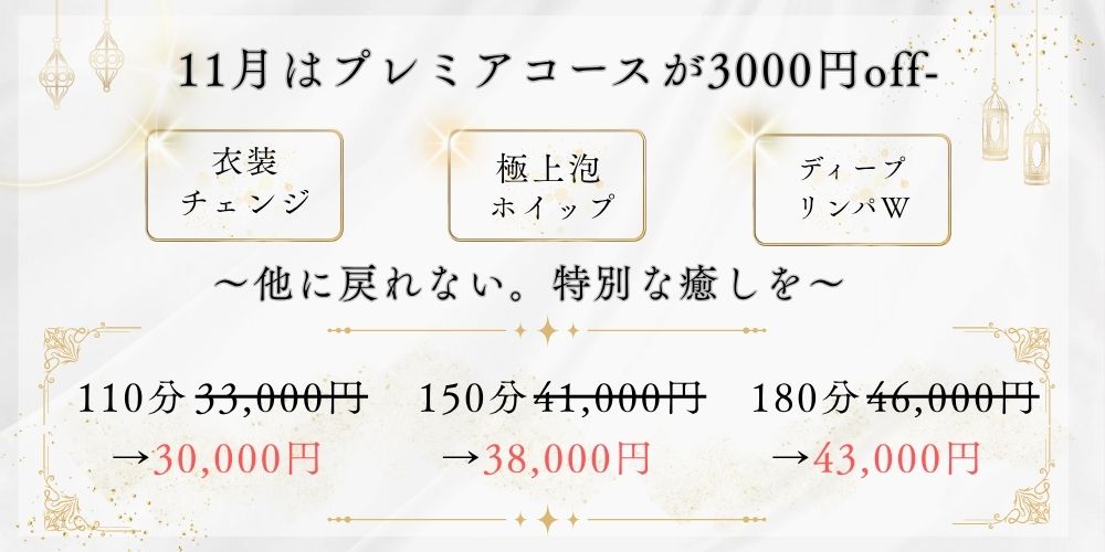 2025/11/1✨期間限定プレミアコースがお得にご利用頂けます✨📅開催期間:11/1~11/30🍀対象:ご新規様,会員様共にご利用可能です🙆♂️プレミア110分
